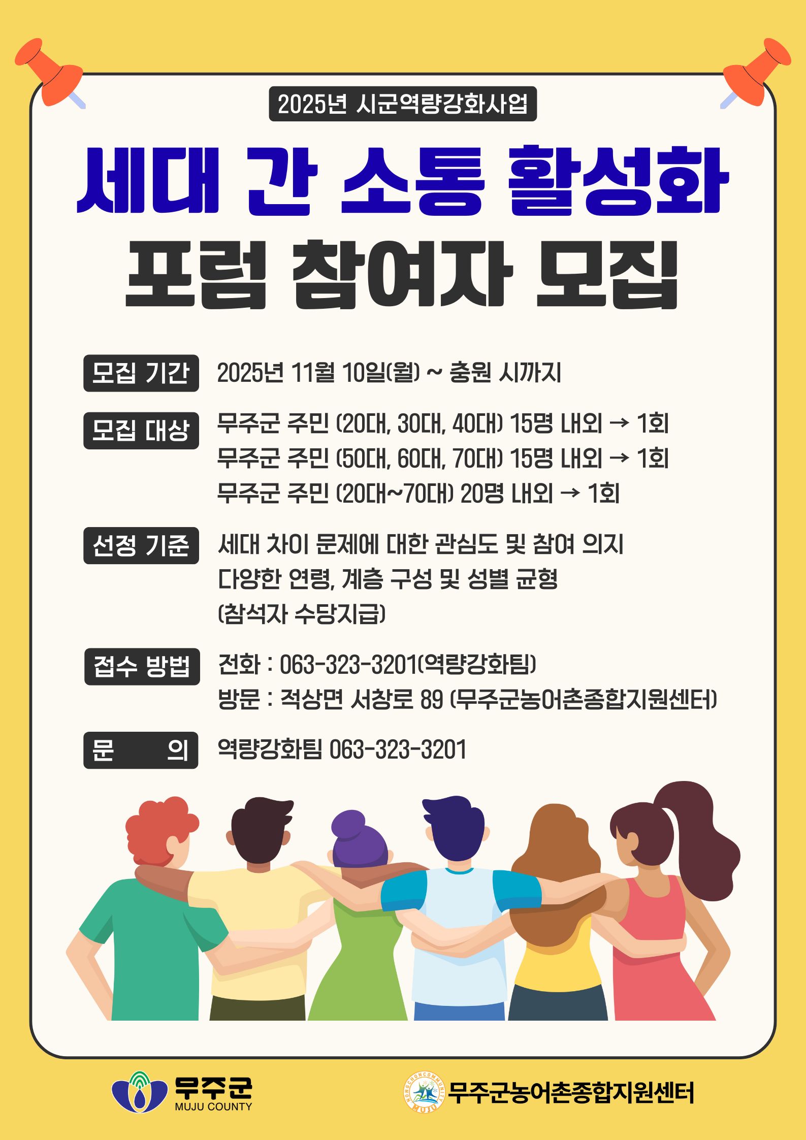 『세대 간 소통 활성화 포럼』 참여자 모집 공고 무주군농어촌종합지원센터에서는 다양한 세대가 상호 이해와 협력을 통해 소속감과 연대 의식을 높이고, 지역 공동체가 자생적으로 성장할 수 있는 기반을 마련하고자 『세대 간 소통 활성화 포럼』을 아래와 같이 개최합니다. 서로 다른 세대가 함께 모여 경험과 지혜, 기술과 창의력을 나누는 이 뜻깊은 자리에 많은 관심과 참여 바랍니다. 2025년 11월 10일 무주군농어촌종합지원센터장 1. 모집 개요 * 모집 기간 : 2025년 11월 10일(월) ~ 충원 시까지 * 모집 대상 및 인원 : 무주군 주민 (20대, 30대, 40대) 15명 내외 → 1회 : 무주군 주민 (50대, 60대, 70대) 15명 내외 → 1회 : 무주군 주민 (20대~70대) 20명 내외 → 1회 * 선정 기준 : 세대 간 소통에 대한 관심도 및 참여 의지 (참여자 수당 지급)
