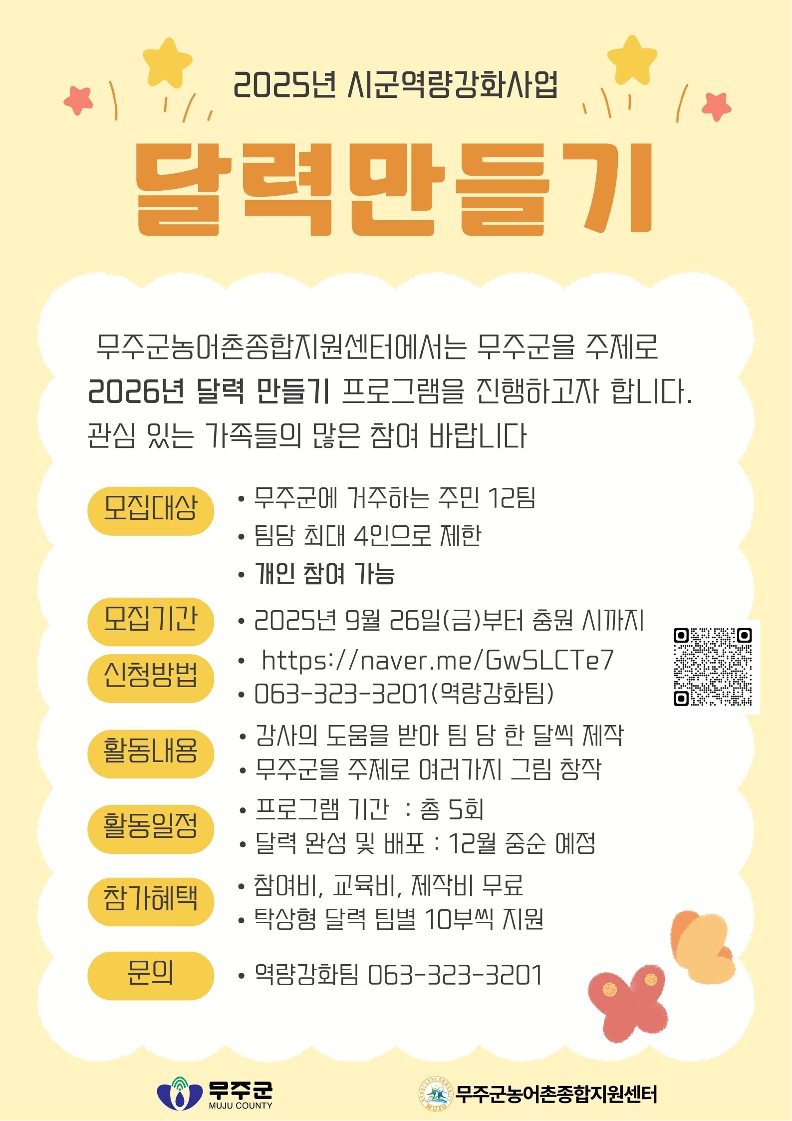 2025년 시군역량강화사업 『달력 만들기』 참여자 모집 공고 무주군농어촌종합지원센터에서는 『2026년 달력 만들기』 프로그램에 함께할 주민을 아래와 같이 모집합니다. 가족, 연인, 친구와 함께 참여하여 추억을 그림으로 표현하고, 완성된 작품은 탁상 달력으로 제작되어 배포됩니다. 관심 있는 주민의 많은 참여 바랍니다. 2025년 9월 25일 무주군농어촌종합지원센터장 1. 모집 대상 * 무주군에 거주하는 주민 12팀(최대 인원 4인으로 제한) * 개인으로 신청 가능 2. 모집 기간 * 2025년 9월 25일(목)~ 충원 시까지 3. 신청 방법 * 온라인 접수 : https://naver.me/GwSLCTe7 * 전화 접수 : 역량강화팀 063-323-3201 4. 활동 내용 * 강사의 도움을 받아 팀별 한 달씩 담당하여 그림 제작 * 무주군을 주제로 창작한 작품을 모아 2026년 탁상 달력 제작·배포 5. 활동 일정 * 프로그램 기간 : 12월 중 5회 * 프로그램 시간 : 18:30~20:30 * 작품 제작 및 배포 : 2025년 12월 말 예정 6. 참가 혜택 * 참여비·교육비·재료비·달력 제작비 무료 * 탁상형 달력 팀별 10부씩 지원