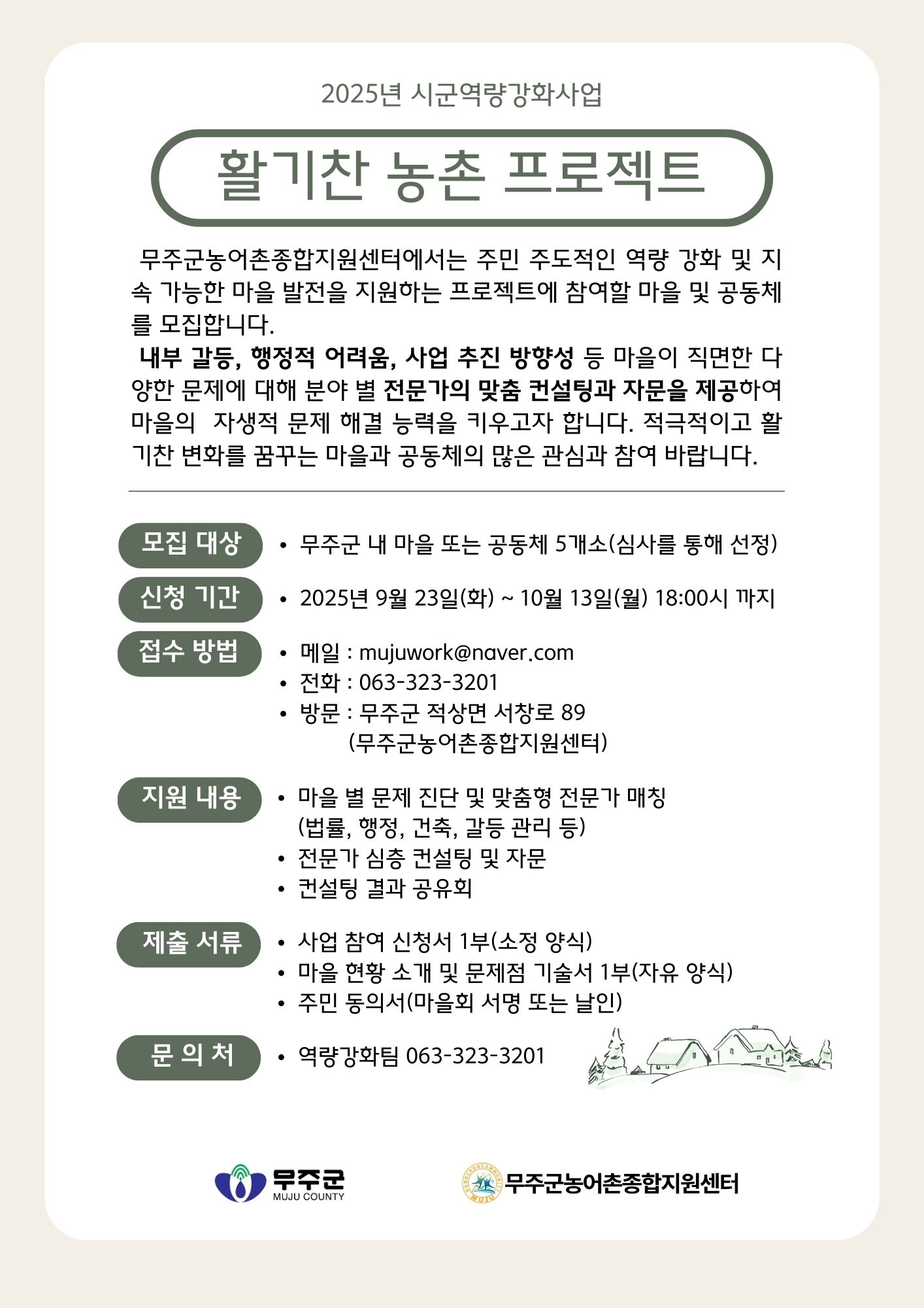 2025년 시군역량강화사업 『활기찬 농촌 프로젝트』 참여 마을 모집 공고       시군역량강화사업의 일환으로 주민 주도적인 역량 강화 및 지속 가능한 마을 발전을 지원하는 '활기찬 농촌 프로젝트'에 참여할 마을을 모집합니다. 내부 갈등, 행정적 어려움, 사업 추진 방향성 등 마을이 직면한 다양한 문제에 대해 분야별 전문가의 맞춤형 컨설팅과 자문을 제공하여 마을의 자생적인 문제 해결 능력을 키우고자 합니다. 적극적이고 활기찬 변화를 꿈꾸는 마을 또는 공동체의 많은 관심과 참여를 바랍니다. 2025년 9월 22일       무주군농어촌종합지원센터장